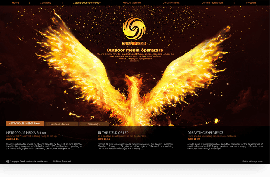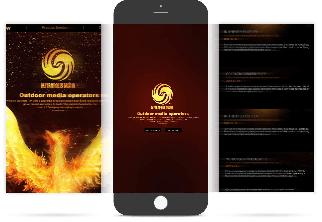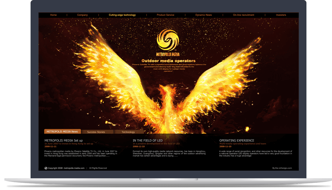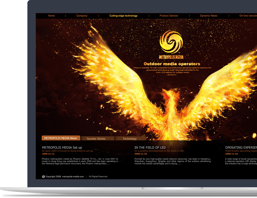 官网以凤凰传媒的标志性图标和凤凰图案作为创意灵感,通过炽热的火凤凰表现凤凰都市传媒澎湃的新闻热情和敢于承担的社会责任。页面视觉感官效果和凤凰都市传媒品牌调性高度吻合,成为凤凰都市传媒在互联网领域闪亮的名片。
