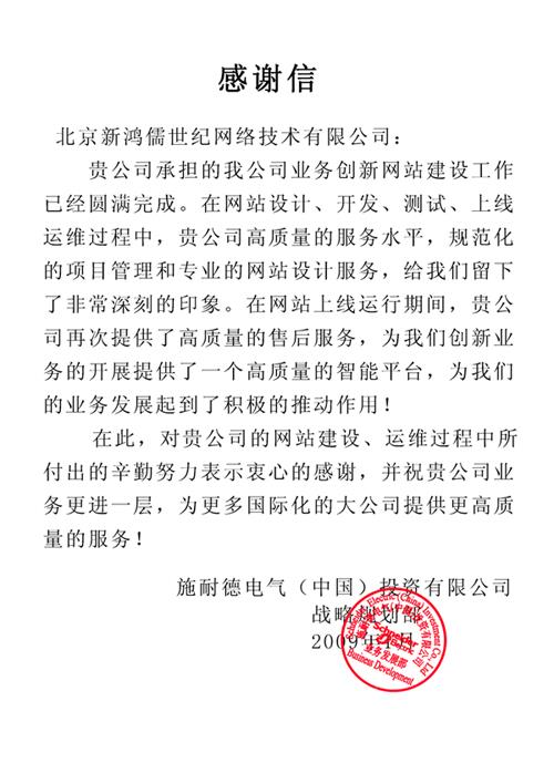 2009年1月施耐德电气特此发来了表扬信,这是对我们工作的认可,也是对我们日后前行发展的鼓励,简简单单的几句评价就为世界杯压球平台_世界杯压球官网(China)官方网站的前行增添了力量。世界杯压球平台_世界杯压球官网(China)官方网站坚信不会辜负客户的希望,会在不断改善自己的同时,飞得更高做得更好来回馈给你们。